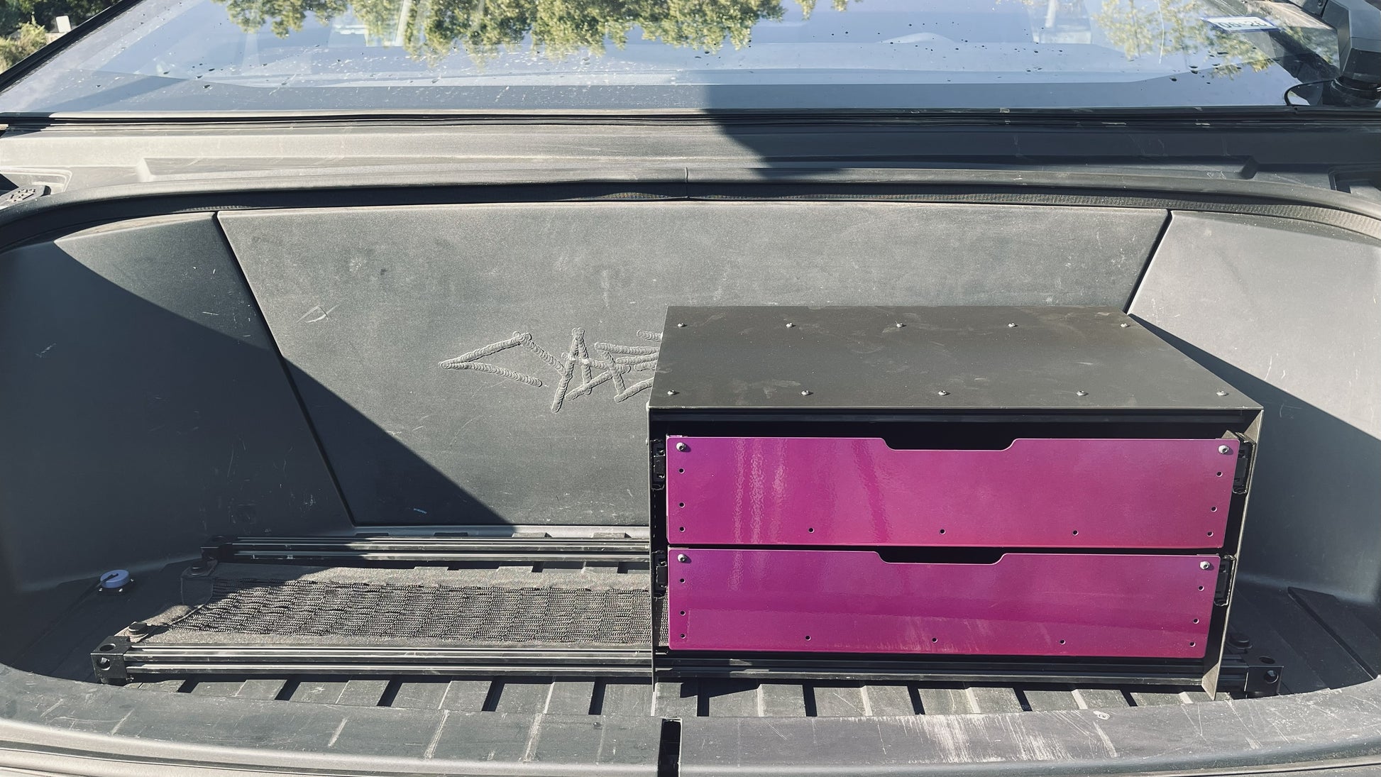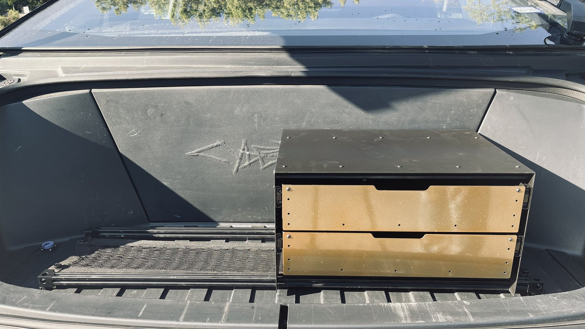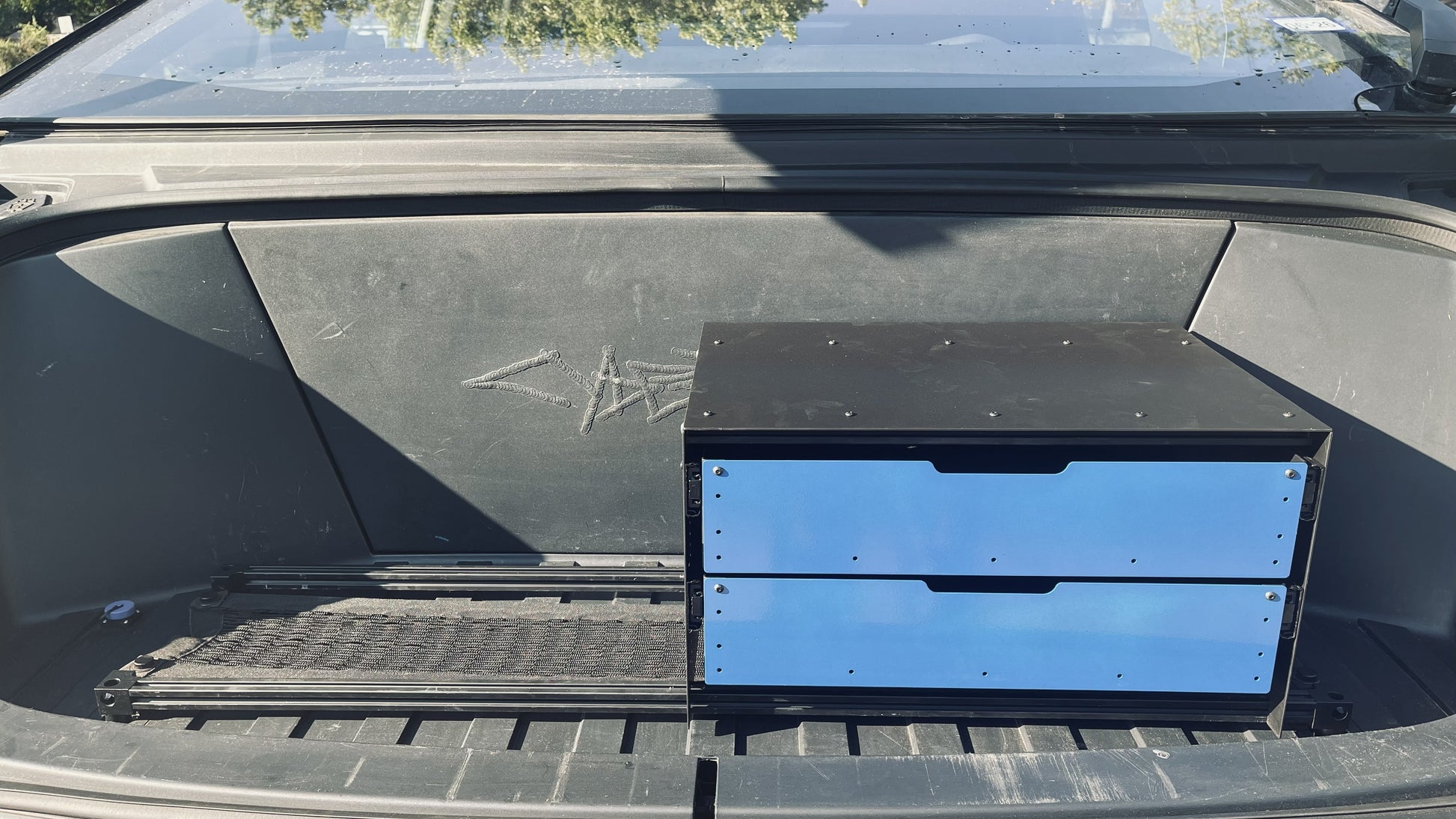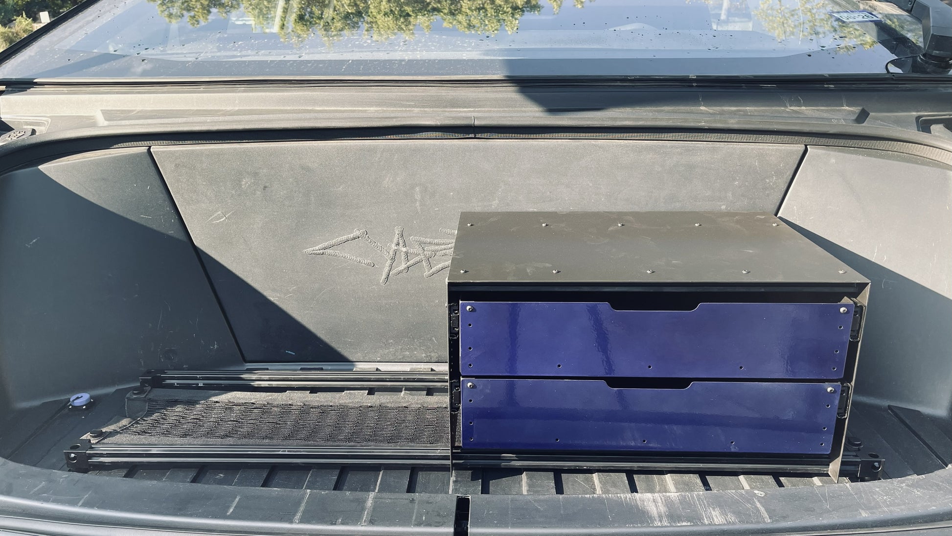 Keep the essentials up front. The Frunk Kit Mini uses two stacked drawers for fast, one‑hand access — and still leaves space for the factory cargo net beside it.